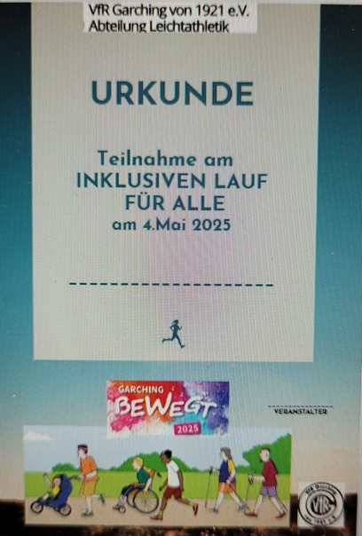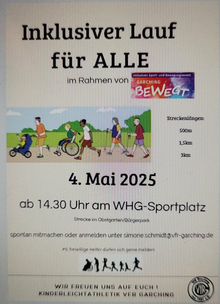Am 4.Mai 2025 fand im Rahmen von Garching bewegt der 1. Inklusive Lauf des VfR Garching Kinderleichtathletik statt. Trotz Regen und Kälteeinbruch standen 64 tapfere Kinder und Erwachsene für 500m bzw. 1,5km an der Startlinie (3km wurden wegen der rutschigen Wegstrecke abgesagt) und freuten sich, an einem Sportevent ohne Leistungsdruck teilzunehmen. Trotz Zeitmessung, Urkunde und Medaille empfanden die Läuferinnen und Läufer zwischen 2,5 und etwa 60 Jahren es als eine sehr lockere und motivierende Atmosphäre und die Mehrheit hat durchwegs den Wunsch nach MEHR Läufen in Garching ausgesprochen. Die Strecken im Bürgerpark / Obstgarten laden auch wirklich alle Läufer ein, in unserer schönen, grünen Natur sportlich zu entspannen. Wir nehmen diesen Laufwunsch gerne auf und kümmern uns um einen echten Garchinger Volkslauf für ALLE!