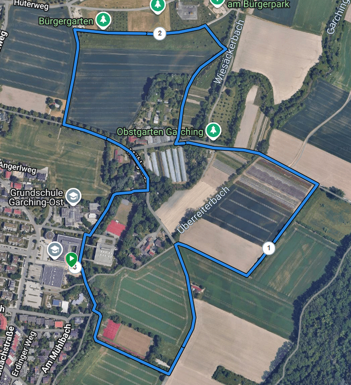 - Laufstrecke: Rundkurs (~ 3 km, Schotter, Asphalt) mit Start und Durchlauf am Theatron des Werner-Heisenberg-Gymnasium (WHG) in Garching. Überblick am Seitenende.
